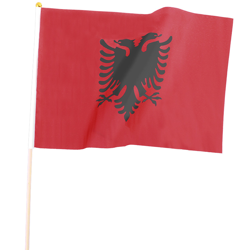 Vlajka Albánska sa vyznačuje červeným pozadím, na ktorom sa nachádza silueta čierneho dvojhlavého orla v strede. Červené pozadie znamená statočnosť, silu a udatnosť, zatiaľ čo čierny orol reprezentuje albánsky ľud po celej Zemi. Vlajka je pripevnená na držadle dĺžky 61 cm a zakončená plastovou zlatou guličkou. Na výrobu vlajky bol použitý polyester. Vlajka je vhodná ako dekorácia do bytu, do podniku či ako symbol počas fandenia.