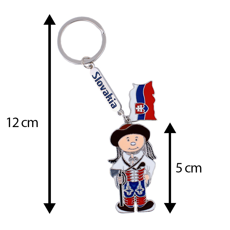 Originálna kľúčenka vhodná ako prívesok na kľúče s nápisom Slovakia, zbojníkom a slovenskou vlajkou. Priemer krúžku na kľúče je 3 cm, celková dĺžka kľúčenky 12cm a dĺžka zbojníka je 5cm.