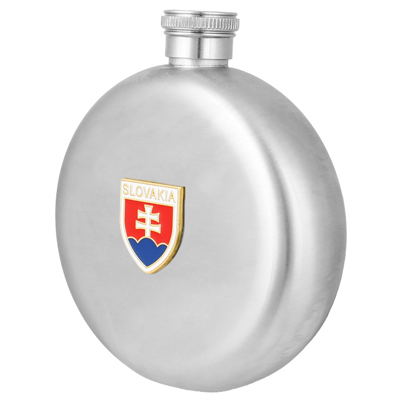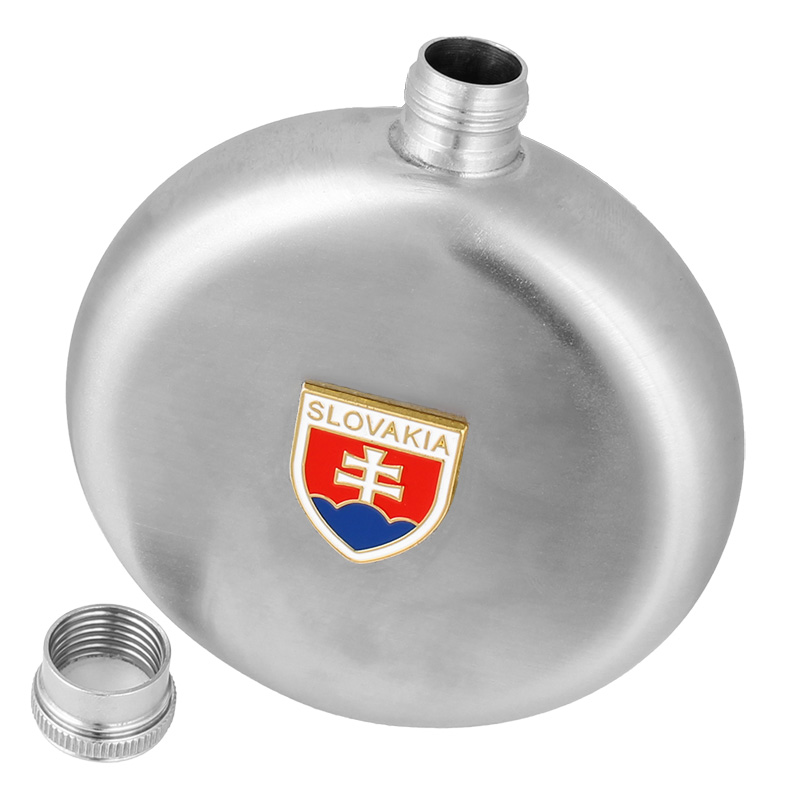 Okrúhla nerezová ploskačka na alkohol. Jedná sa o klasickú ploskačku s objemom cca 150 ml (5 oz). V prednej časti sa nachádza Slovenský znak s nápisom Slovakia. Môže ísť aj o praktický darček pre muža aj ženu.