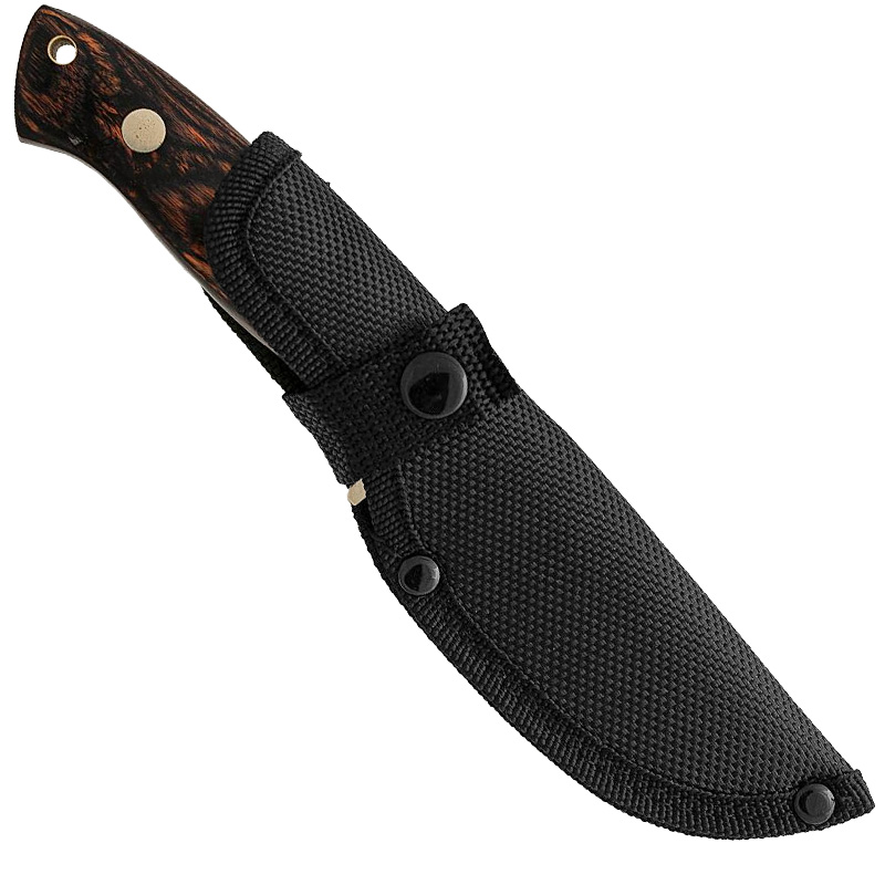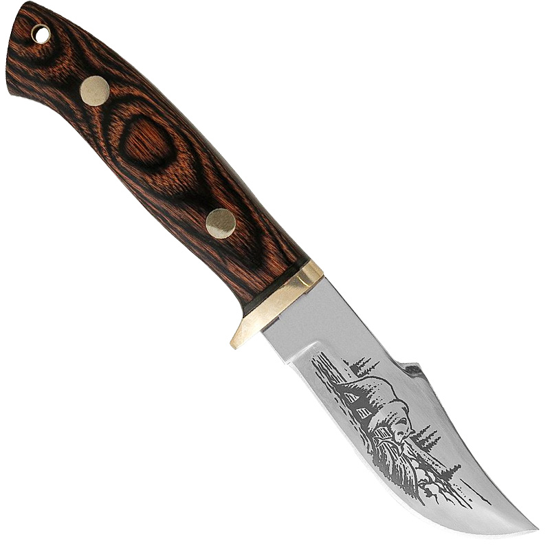 Malý, ale mimoriadne robustný lovecký nôž, ideálny pre tie najnáročnejšie úlohy. Nôž sa vyznačuje full-tang konštrukciou, ktorá poskytuje maximálnu odolnosť voči poškodeniu. Monolitická časť rukoväte a čepeľ v tvare bowie sú vyrobené z vysoko kvalitnej nehrdzavejúcej ocele 420. Čepeľ je na oboch stranách zdobená obrázkom medveďa. Lovecký nôž má ergonomickú a veľmi pohodlnú rukoväť s drevenými šupinami. Kovová záštita zabraňuje náhodnému skĺznutiu ruky smerom k ostriu. Lovecký nôž má v zadnej časti otvor na zavesenie šnúrky alebo kľúčenky. Súčasťou je klasické čierne puzdro z Cordury, ktoré je možné pripevniť na opasok. Jedná sa o perfektný darček pre poľovníka, skauta, rybára alebo akéhokoľvek outdoorového nadšenca.
