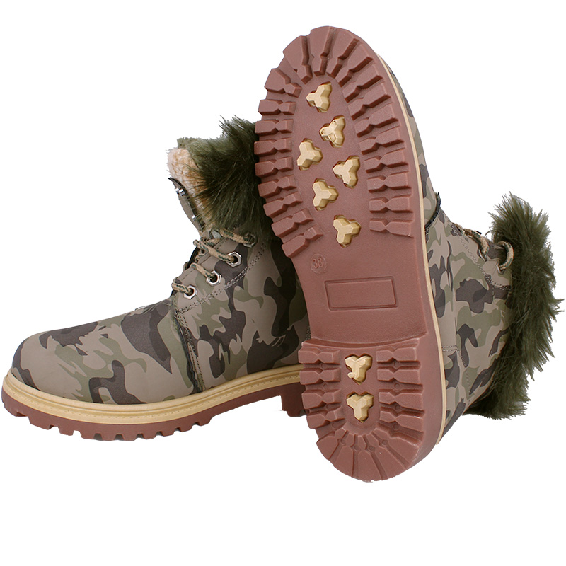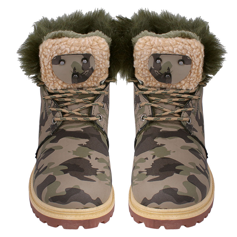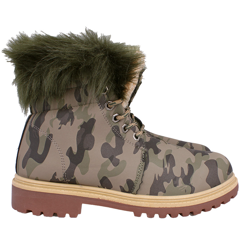 Dámske topánky na zimu v maskáčovom prevedení so šnurovaním. Zvnútra sú zateplené hebkou kožušinou vďaka čomu sú tieto dámske zimné topánky ideálne do chladného počasia, do prírody a pod. Podrážka je tvorená kvalitným polyuretánom, ktorý sa vyznačuje odolnosti voči nárazom, šmyku alebo oleju. Jemná kožušinka vo vnútri obuvi zasa príjemne hreje aj počas mrazivého počasia.