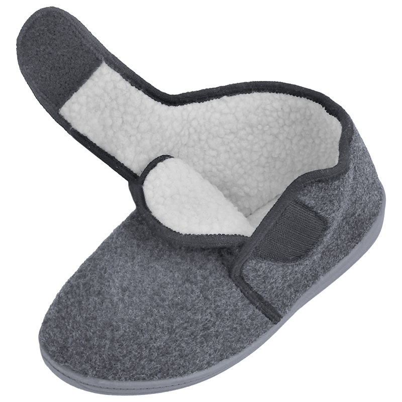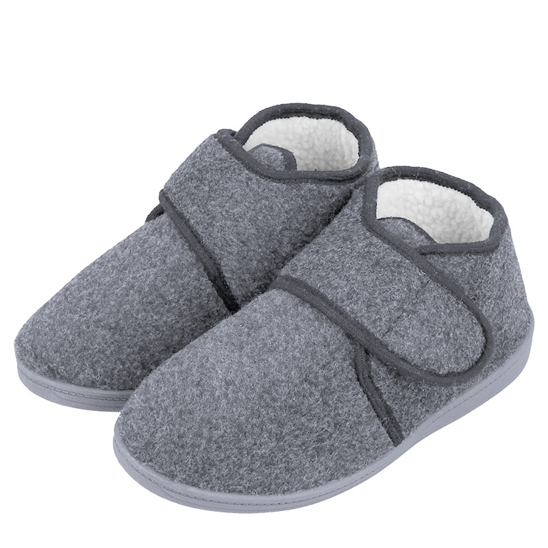 Pánske zimné kapce v bledošedej farbe sú ideálna zimná obuv so zateplením a protišmykovou podrážkou. Vnútorné zateplenie je tvorené kožušinou, ktorá spoľahlivo ochráni nohy pred mrazom vo vonkajšom prostredí. Bezproblémový pobyt v mrazivom počasí vám umožní aj dôkladne navrhnutá podrážka, ktorá bola vyhotovená z gumy, aby sa predišlo pošmyknutiu na ľade. Vonkajší povrch kapcov je tvorený hebkým filcom z polyesteru. Jednoduché nazúvanie a vyzúvanie je dosiahnuté vďaka zapínaniu na suchý zips. V skratke sú tieto kapce pre seniorov tou správnou obuvou za rozumnú cenu. Ponúkajú všetko, čo by mala tá správna obuv na zimu mať.