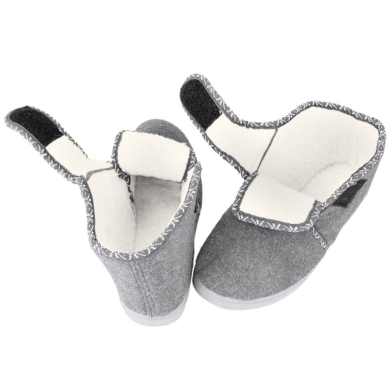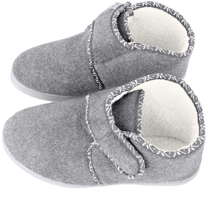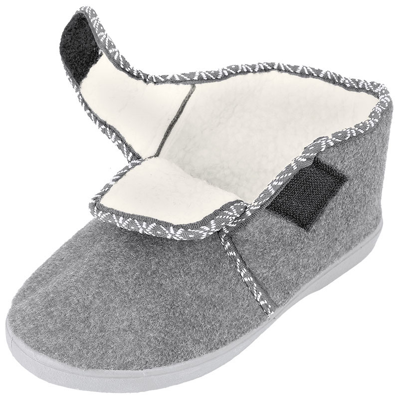 Kapce pre seniorov dámske sivé sú ideálnou voľbou pre tých, ktorí hľadajú komfortnú obuv na doma aj von. Zvršok aj vnútorná vrstva obuvi je vyrobená z jemného filcového materiálu, ktorý je veľmi príjemný na dotyk. Tieto dámske kapce sú vďaka ich hrubému prevedeniu vhodné do teplého ale aj chladného či prechodného počasia v roku. Zapínanie funguje na princípe suchého zipsu. Podrážka bola vyhotovená z polyuretánu, ktorý zaisťuje správnu stabilitu a pevnosť. Tieto filcové papuče sú tak kvalitnou obuvou ale aj ideálnym darčekom pre seniora, ktorý potrebuje poriadne kapce.