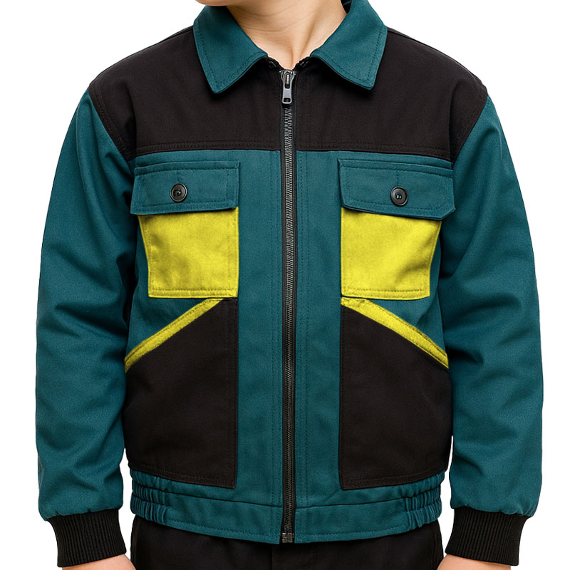 2 predné veľké vrecká zvýraznené žltým lemom a 2 zvýraznené náprsenkové vrecká žltej farby so zapínaním na gombíky