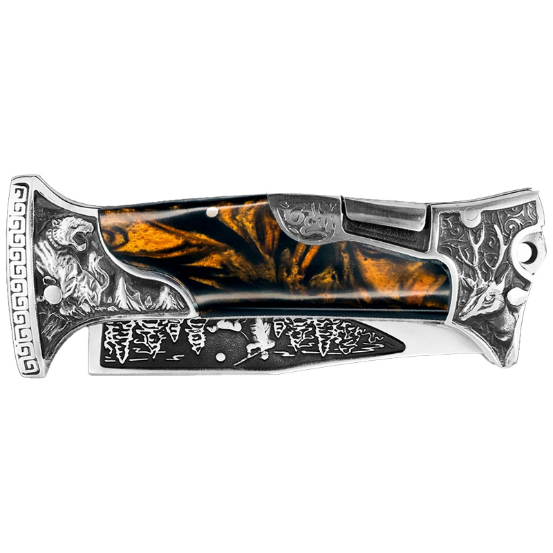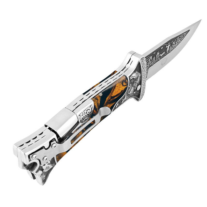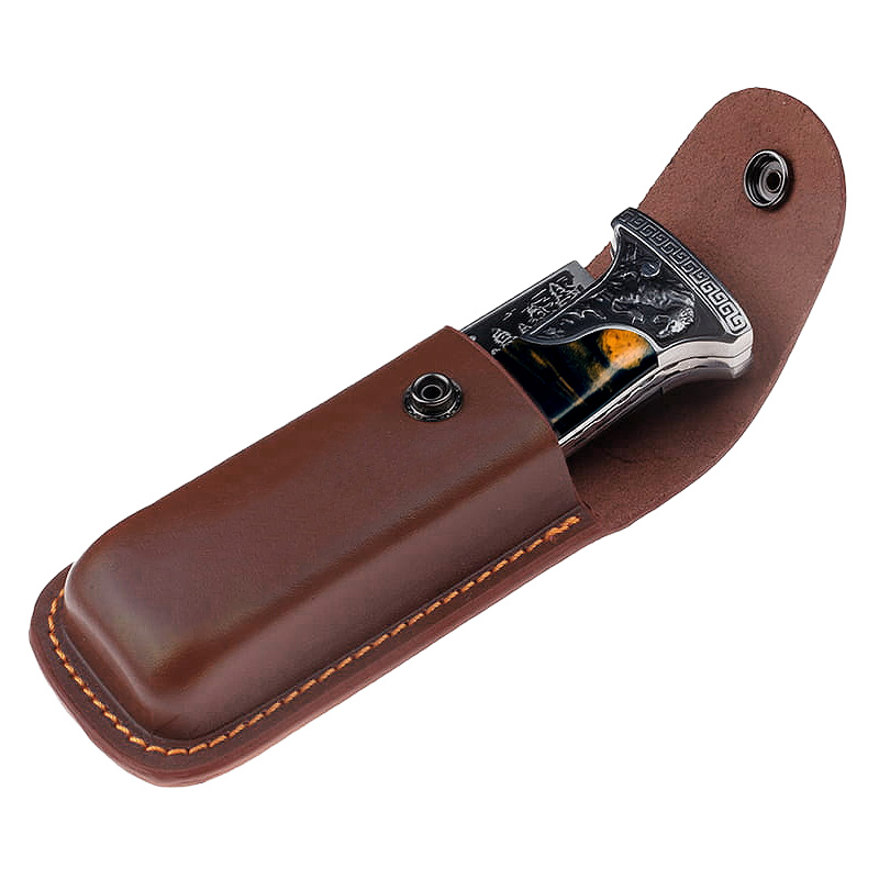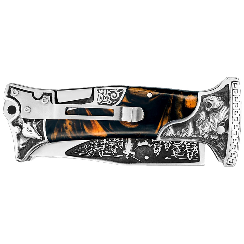 Senzačný a bohato zdobený lovecký nôž na každú príležitosť. Toto je nástroj, ktorý je dobré mať vždy poruke a vďaka vstavanému kovovému klipu je to oveľa jednoduchšie. Čepeľ má klasický clip point profil a je vyrobená z kvalitnej nerezovej ocele 440. Tento materiál je mimoriadne odolný a odolný voči prípadnému poškodeniu. Čepeľ má obojstranné lovecké rytie s čiernym povlakom. Masívna, ergonomická rukoväť perfektne padne do ruky a poskytuje pevné uchopenie počas prevádzky. Je vyrobená zo zdobených kovových prvkov a tmavého dreveného obloženia. Široká záštita účinne chráni ruku pred skĺznutím smerom k reznej hrane. Nôž sa otvára klasickým spôsobom potiahnutím čepele druhou rukou. Je vybavená zadným zámkom, ktorý znehybní čepeľ v otvorenej polohe. Súprava obsahuje pevné kožené puzdro, ktoré možno pripevniť na opasok. Ide o perfektnú pomôcku, ktorá poslúži ako darček pre každú príležitosť.
