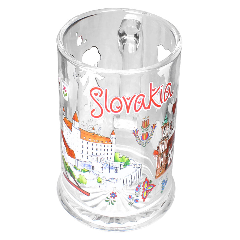 Sklenený pohár s uškom so slovenským motívom ideálny ako pohár na pivo ale aj na iné nápoje. Objem pohára je 400ml a bol vyrobený zo skla. Uško pohára je možné chytiť so štyrmi prstami. Ide o ideálny slovenský suvenír alebo aj praktickú dekoráciu do domácnosti